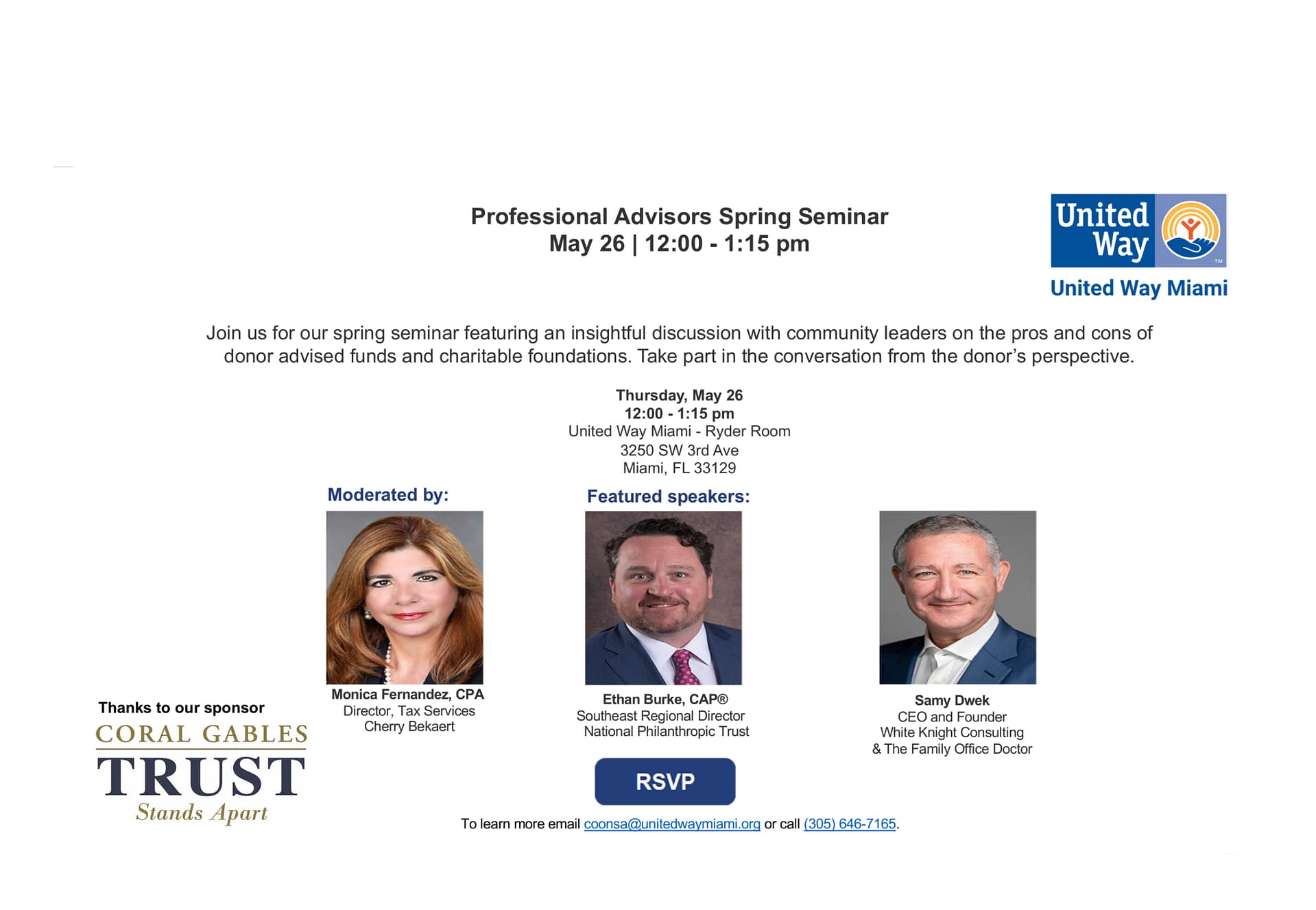 I spoke on a panel for The United Way of Miami’s Professional Advisor Committee around the pros and cons of Donor Advised Funds (DAFs) versus Charitable Foundations. Please enjoy the recording of the panel discussion, which was moderated by Monica Fernandez, Director of tax Services at Cherry Bekaert